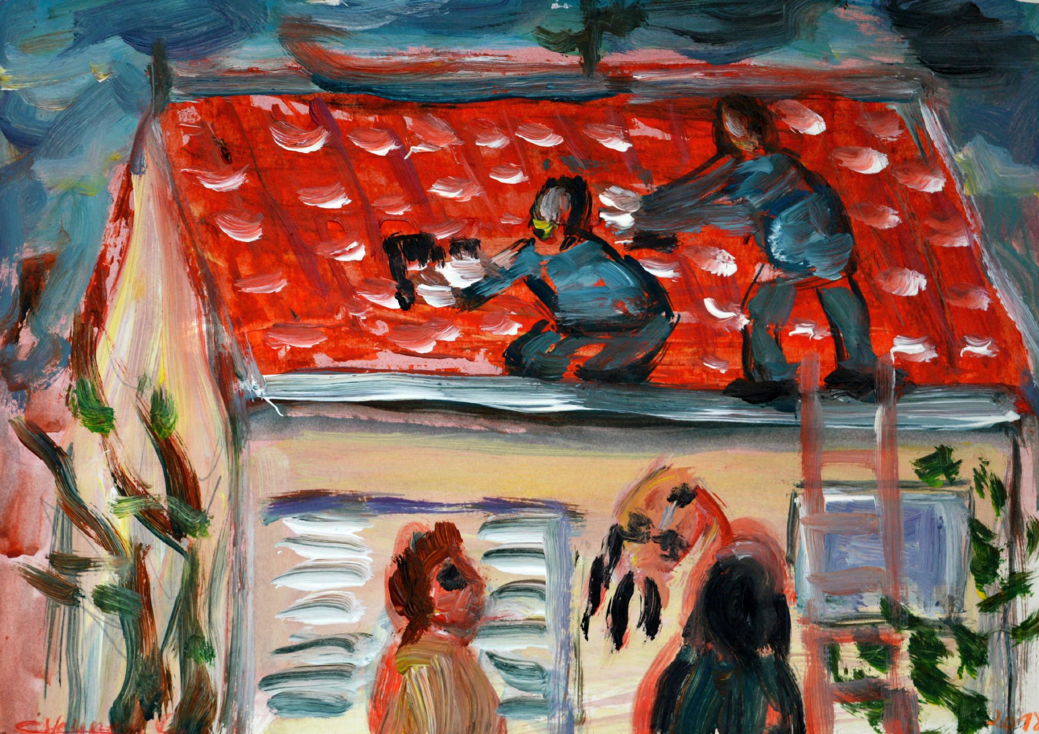 The mischief of heavy hailstorms on Pentecost Monday 2014 were an inspiration to me for a lot of memory pictures (virtual worlds) because of the emotional consequences the extreme damage and the enormous efforts to protect and repair the buildings and later the attitude of the assurance not willing to pay the damage, but less than half of it even done by cheap roofers. A lot of cleaning on the roof, dragging sails and palettes on and off the latter, assessing the damage and the repair by the roofers are noted in a joyful and colorful way. A smile and a tear are close.Lees meer >> | 1 keer bekeken