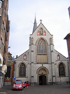 Na afloop bewonderden we de stille schatten uit oudere tijden en maakten een rondgang langs prachtige houten gesneden beelden uit de renaissance, zagen ingetogen en exuberante schilderijen en boeiende zwart en witte altaren uit marmeren geborduurde standaarden. Dan ontmoetten we George, de koster voor wie de kerk zijn leven was, al als kleine jongen en waar die kunstschatten in vergroeid waren als mangroven in het water. Wij spraken hem aan over het geld dat we voor een kataloog over de Scheutisten in het mandje legden. De vragen die we hem toefluisterden maakte een boek van geschiedenis los en hij gidste ons, twee gretige luisteraars door zijn schatten heen. Zijn kruisweg reeg zich rond de kerk als een verhaal, ingetogen en geschilderd door een Sint-Niklaase Ingres uit de 19e eeuw. Christus was daarop geen belabberd figuur maar een duchtige atleet.De prachtige madonna met kind , heel beweeglijk en uitzonderlijk mooi in de zijbeuk bleek uit albast. Een prachtstuk. Het hoofdaltaar bleek uit waardevolle carrara marmer, de rechterzijbeuk uit niet meer bestaande Belgische marmer : uitgeput zoals zovele grondstoffen, een vingerwijzing naar een opgeteerde toekomst. De standaarden vertelden een eigen verhaal van St-Nikolaas de patroonheilige volledig ingenaaid in zilverdraad die nu zwart oogde. Het grote schilderij achteraan in de middenbeuk bleek een zoals Rubens geschilderd doek door een tijdgenoot, prachtig in kleur en beweging:: een helder venster in het gotische geheel.De kerk zelf was oorspronkelijk een klein houten gebouwtje dat de verbetering naar steen doormaakte en oorspronkelijk Romaanse elementen bevatte, later vergroot werd tot een kerkje van enkel zijbeukafmetigen met Gothische elementen .Nog later werd alles uitgerokken, maar bleef laag en werd dan uiteindelijk opgehoogd tot zijn hedendaagse gothische glorie met fijne lichtinval.